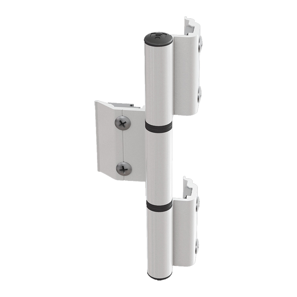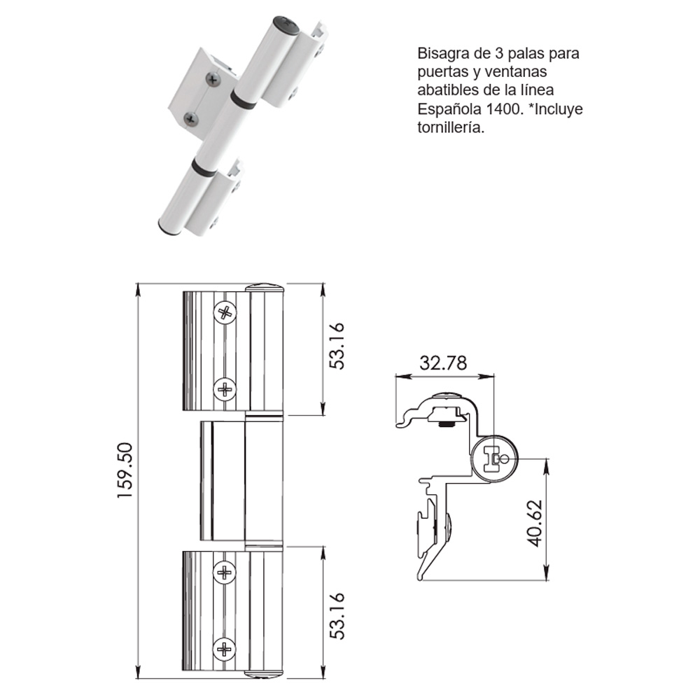 Bisagra 3 palas para perfiles de cámara Europea. Empacadas con contra placas pre-montadas, pernos y casquillos que facilitan la selección de la mano derecha o izquierda.