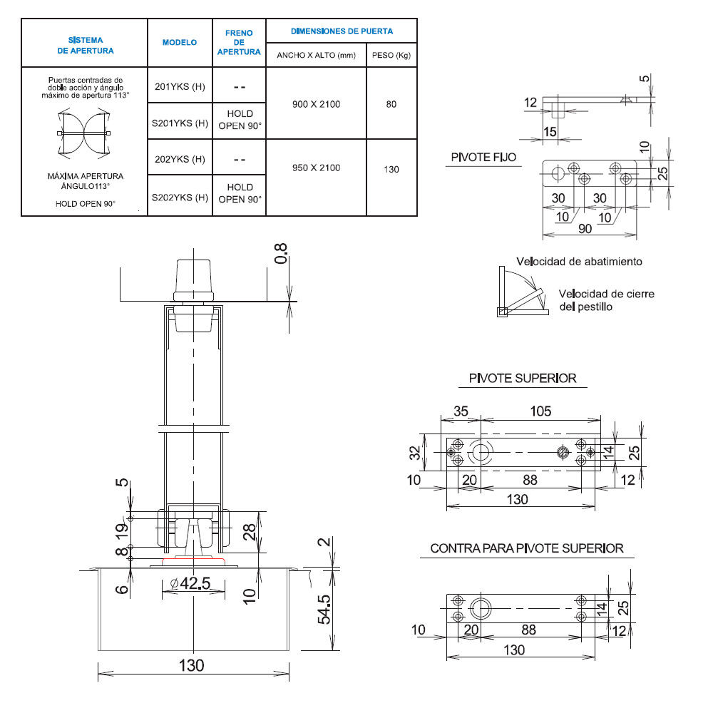 Bisagra de piso Ryobi modelo S202 YKS, con ajuste vertical: hacia arriba y abajo, que facilita su instalación; ideal para puertas de cristal templado ó puertas dobles, incluye accesorios Peso Máximo 110Kg Ancho Máximo 900mm Alto Máximo 2100mm Freno a 90° Apertura a 90°