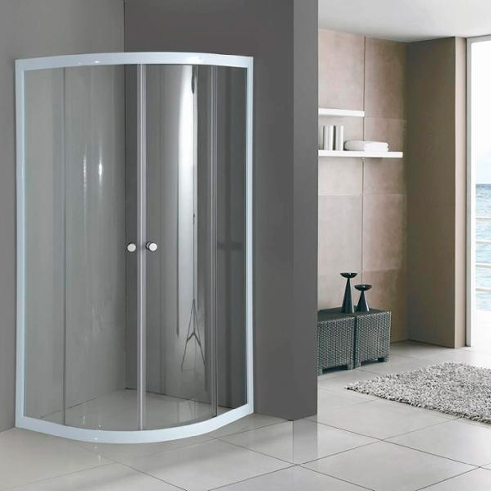 Cancel de baño corredizo curvo con estructura de aluminio extruido, paneles de cristal templado de 6mm de espesor, puertas con sujeción magnética y sello hermético en las uniones para evitar filtraciones. Medida de línea: 0.90 x 0.90 x 1.85m