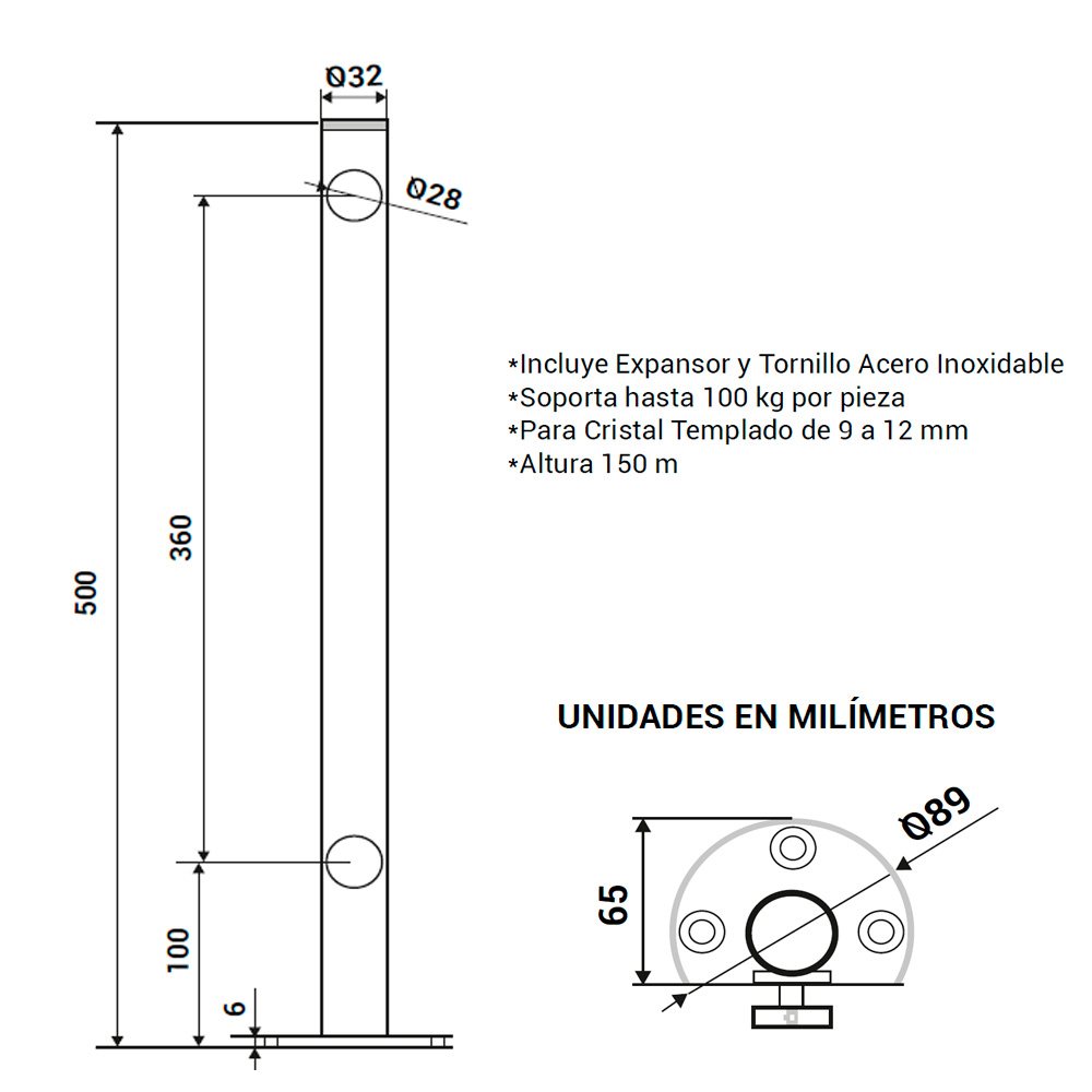 Asegure sus paneles de vidrio con el miniposte profesional de DAWH. Diseñado para trabajar con cristal templado de 9 a 12 mm, es la solución perfecta para pasamanos y delimitaciones de espacios. Su construcción hueca facilita el manejo sin perder robustez, permitiendo una separación máxima de 1.50 m entre postes para garantizar la integridad del sistema. Soporta hasta 100 kg por pieza.