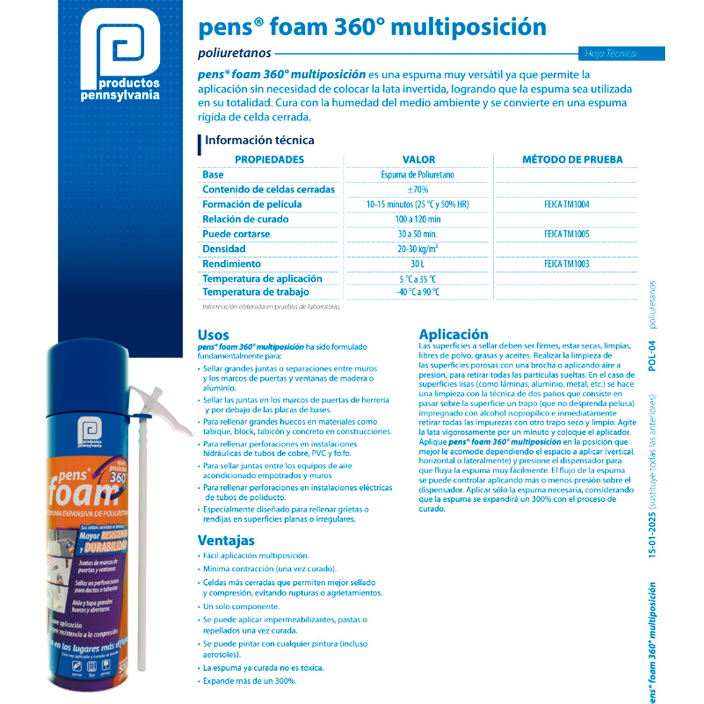 Espuma de poliuretano con una nueva fórmula que permite la aplicación de la espuma de forma versátil ya que no se requiere poner de cabeza la lata. Al expandirse, las celdas son más cerradas lo que permite un mejor sellado y compresión, así como que sea lo suficientemente fuerte para evitar cualquier ruptura o agrietamiento de la misma.