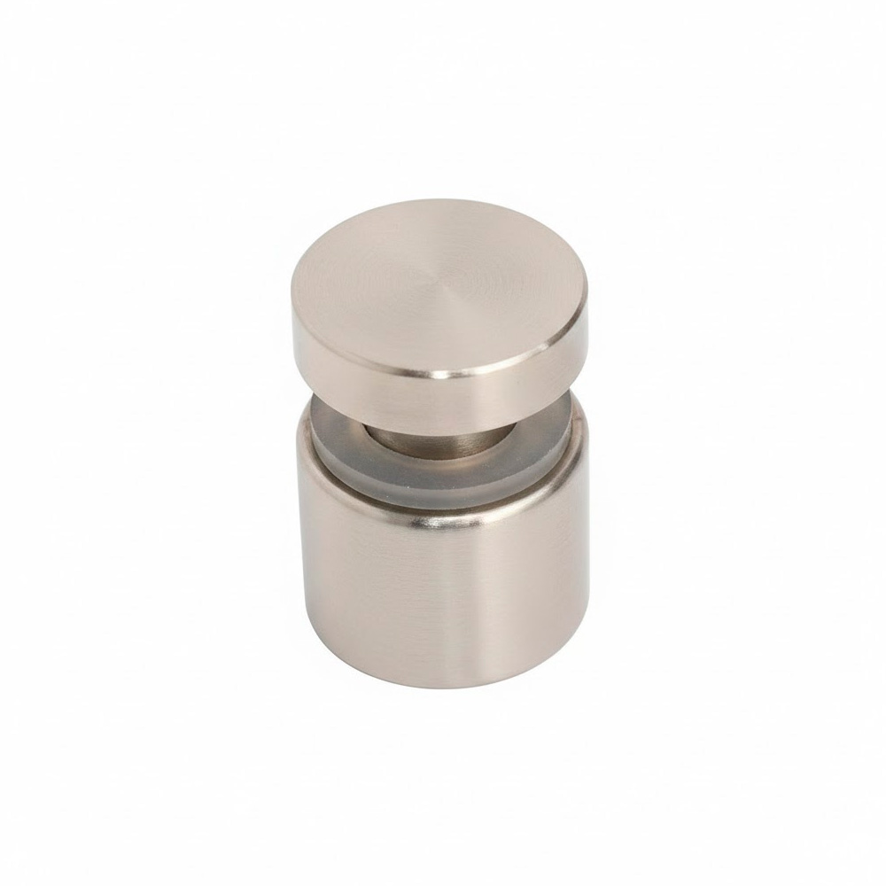 Soporte Tubular Acero Inox Satin Muro a Vidrio, de 19 mm de diámetro x 20 mm de largo base. Diámetro del tornillo tensor 12mm. Espesor Para cristal de 6 a 10 mm de espesor. Requiere barreno de 13 mm