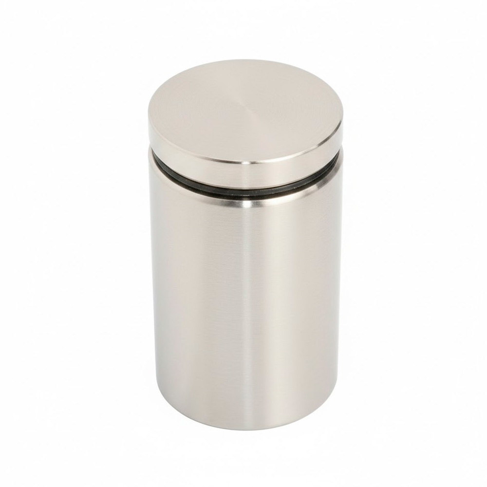 Soporte Tubular Acero Inox Satin Muro a Vidrio, de 30 mm de diámetro x 50 mm de largo base. Diámetro del tornillo tensor 12mm. Espesor Para cristal de 6 a 10 mm de espesor. Requiere barreno de 13 mm